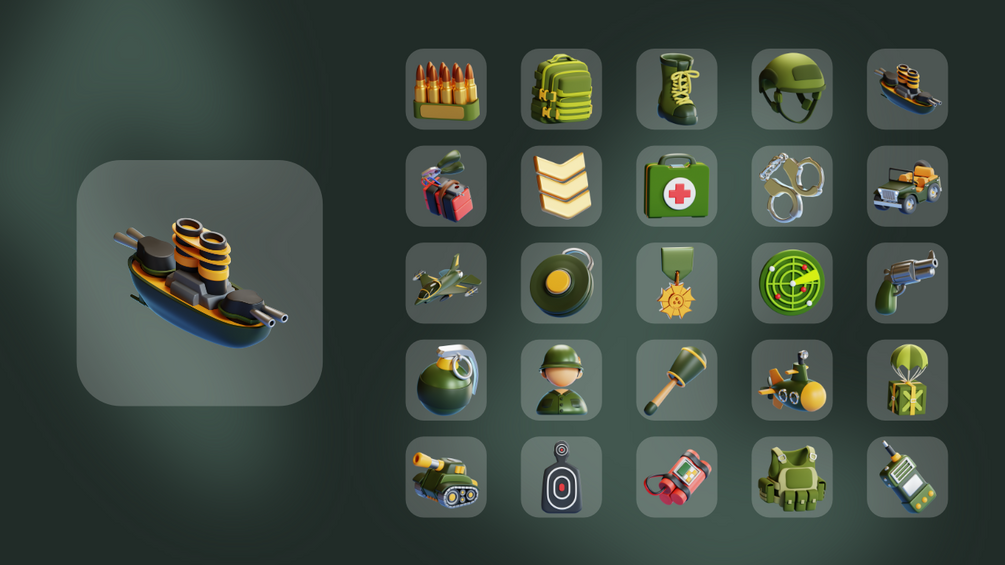 Collection for 25 Army 3D icons. Comes with Blender files and PNG files rendered in 3000x3000 pixel