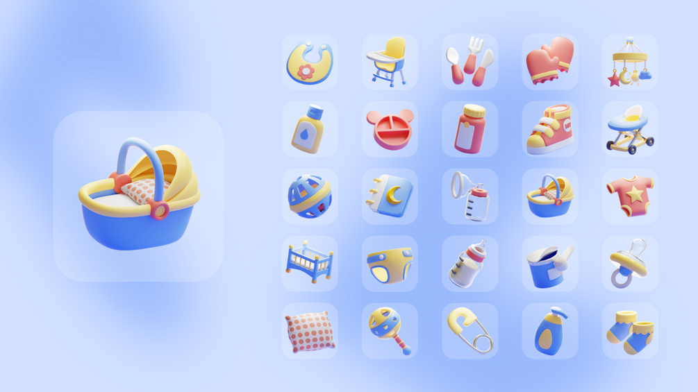 Collection for 28 Baby & Kids 3D icons. Comes with Blender files and PNG files rendered in 3000x3000 pixel