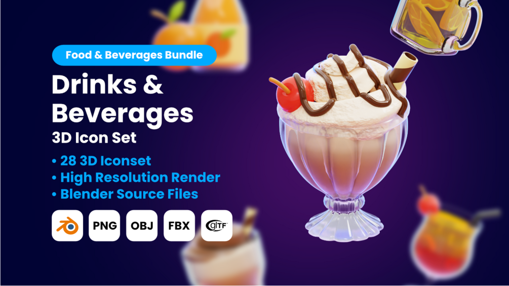 Collection for 28 Drink & Beverages 3D icons. Comes with Blender files and PNG files rendered in 3000x3000 pixel