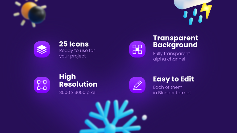 Collection for 25 Weather 3D icons. Comes with Blender files and PNG files rendered in 3000x3000 pixel
